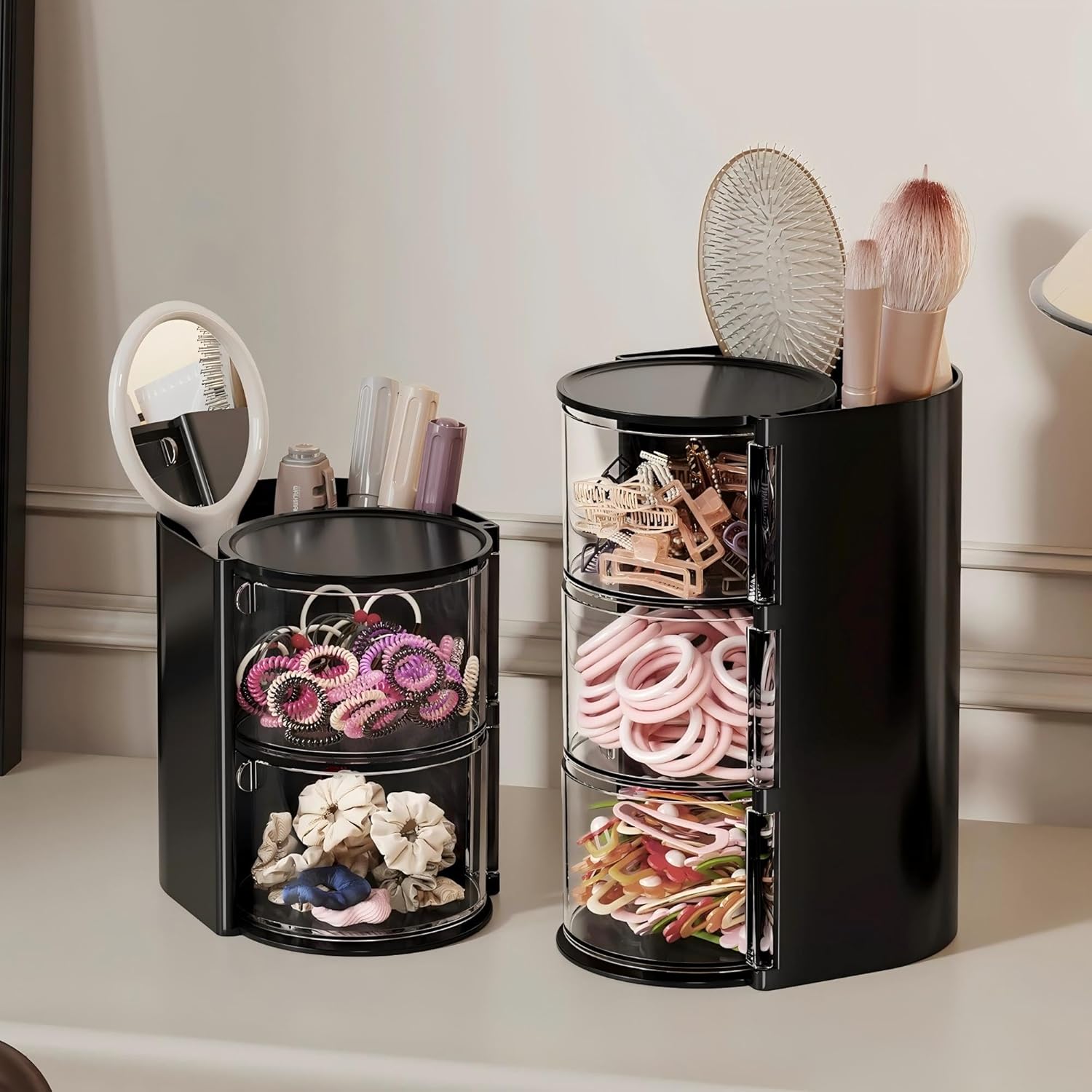 The Hair Accessories Organizer with Hair Brush Holder is a revolutionary, space-saving storage solution designed to declutter and beautifully display all your essential beauty items. This multi-tiered, rotatable organizer features specialized compartments and hooks to securely hold everything from necklaces and earrings to bracelets, rings, makeup brushes, and hair clips. Its intelligent design includes a dedicated central holder for your hairbrush, keeping it clean and within easy reach. By combining elegant functionality with a 360-degree rotating base, it transforms vanity table chaos into an organized, accessible, and stylish display.