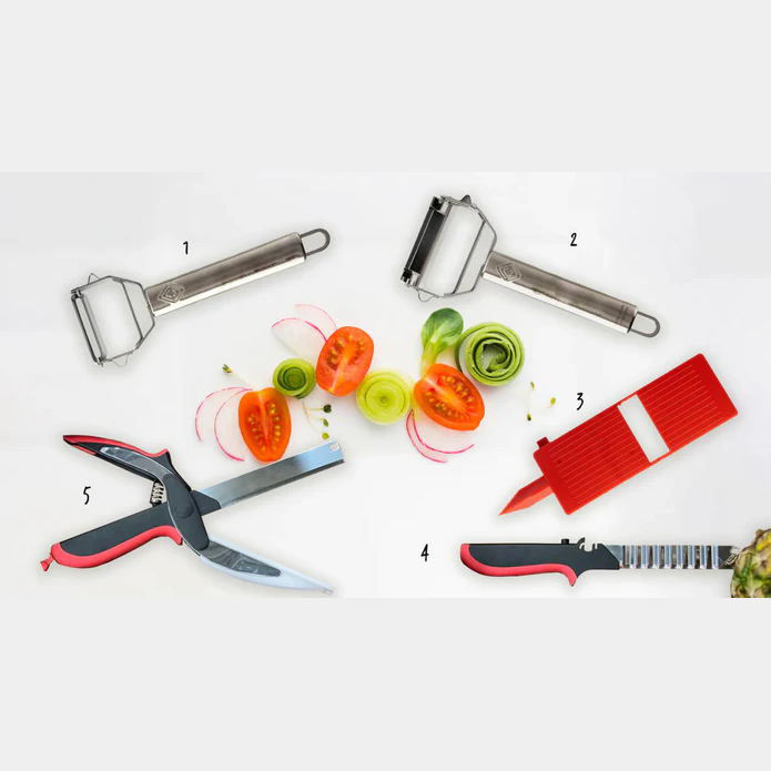 Includes essential peelers, slicers, and shears to handle fruits, vegetables, herbs, meat, and packaging with ease.